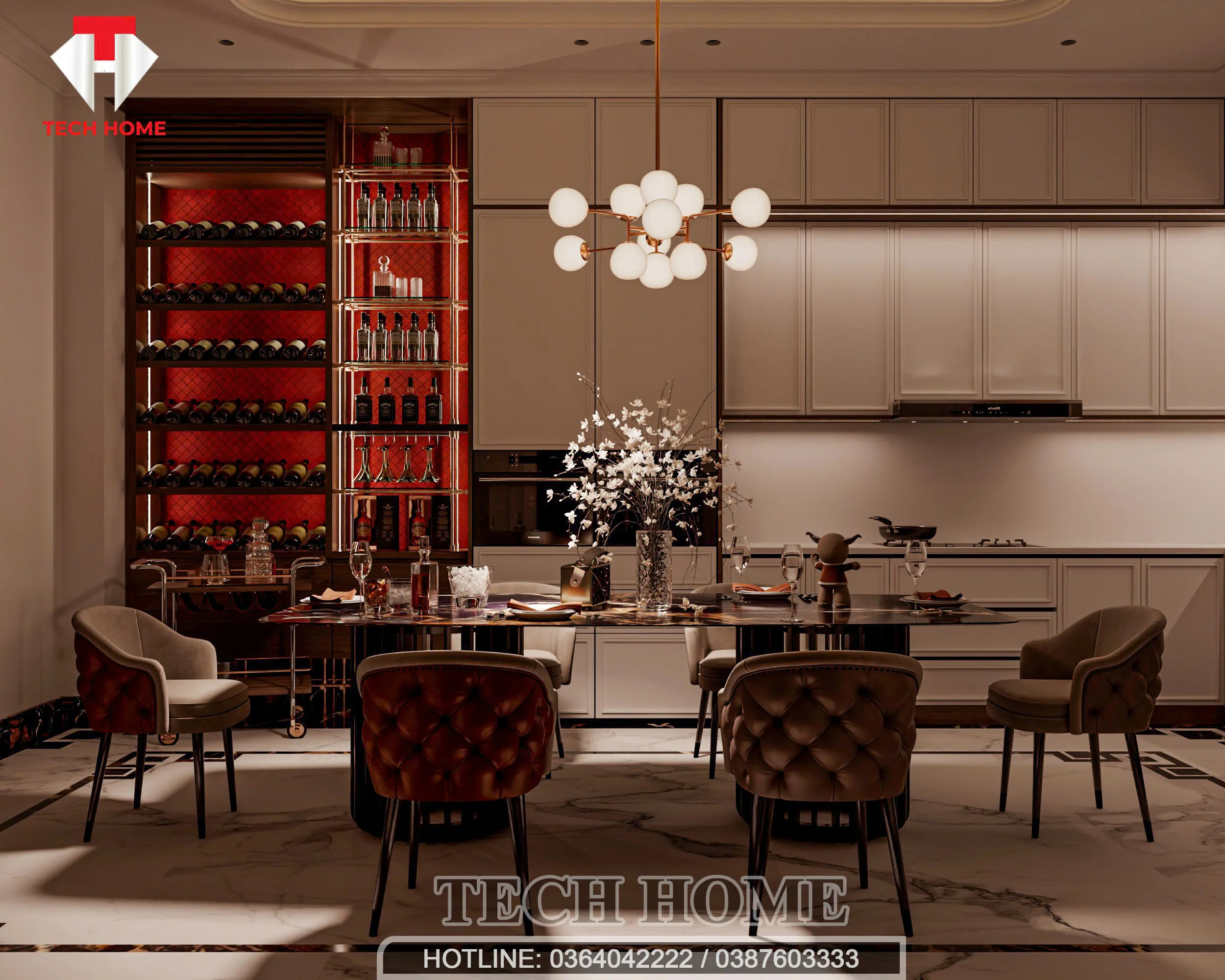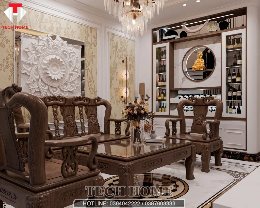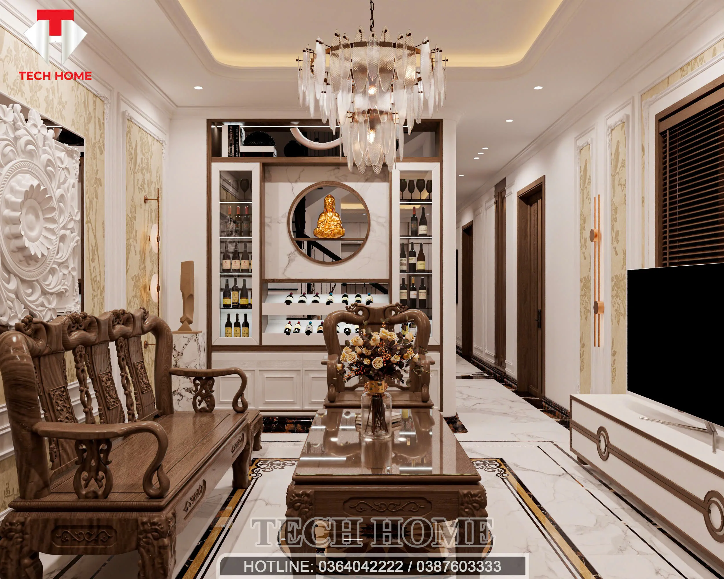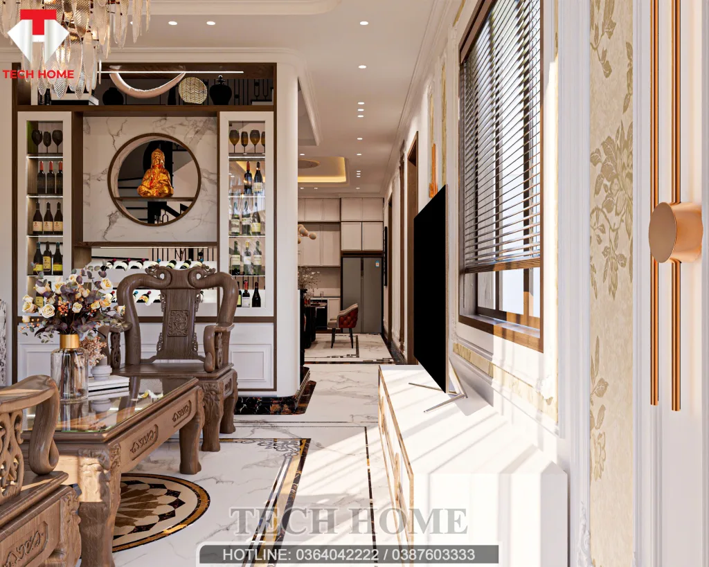 Với các hình ảnh phối cảnh nội thất , Techhome đã khéo léo sử dụng các vật liệu và chi tiết trang trí đặc trưng: Phào chỉ tường và trần thạch cao được tạo hình nghệ thuật, màu sắc trung tính (trắng kem, be, nâu trầm) làm chủ đạo, và các điểm nhấn vàng đồng/vàng kim lấp lánh. Sự xuất hiện của bộ sofa gỗ chạm khắc và tủ rượu đỏ rực càng làm tăng thêm vẻ quyền quý, tạo nên một không gian sống không chỉ đẹp mà còn mang đậm dấu ấn cá nhân và vị thế của gia chủ. Đây là giải pháp hoàn hảo cho những gia đình tìm kiếm sự sang trọng, bền vững và giá trị thẩm mỹ vượt thời gian.