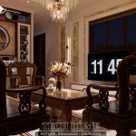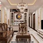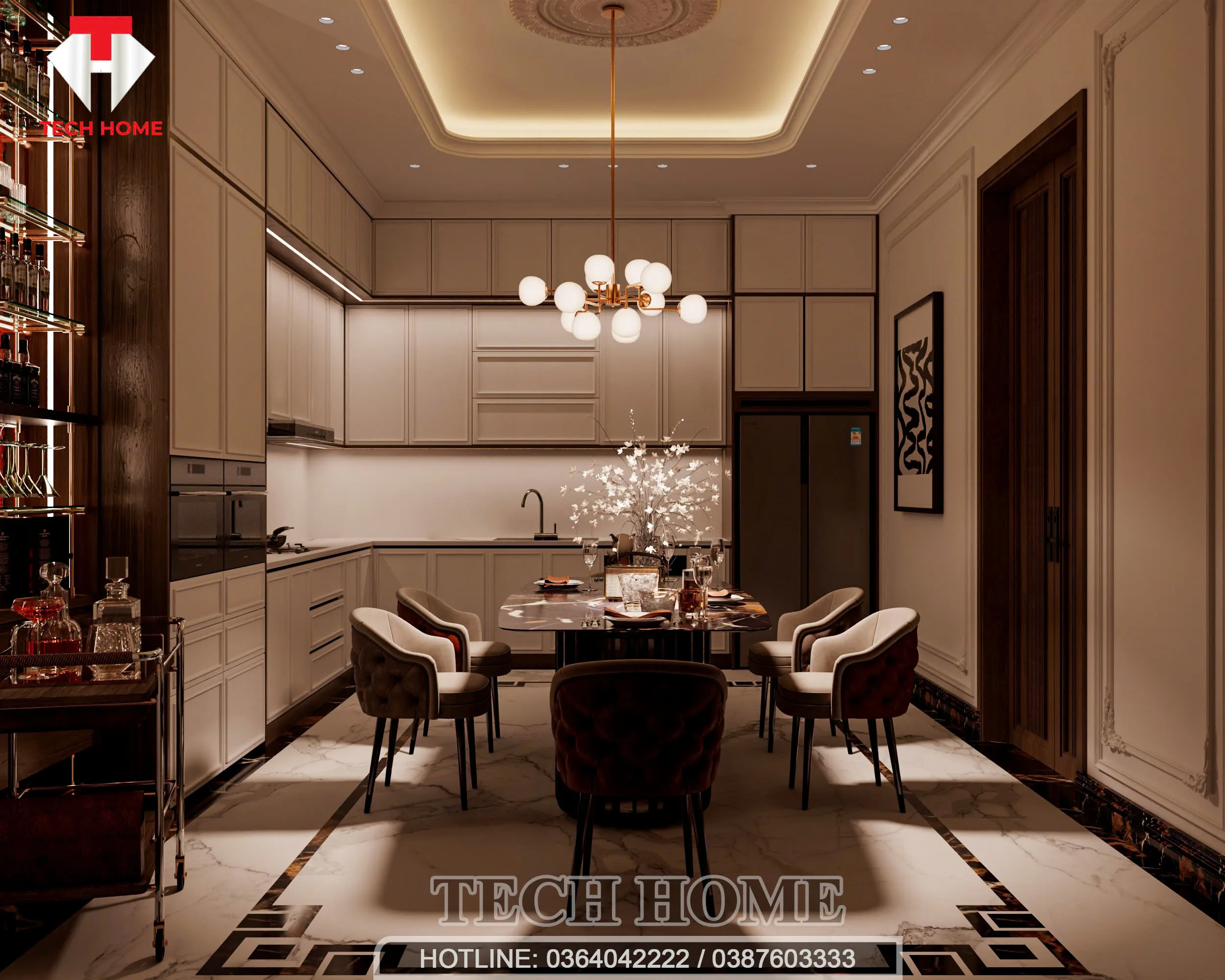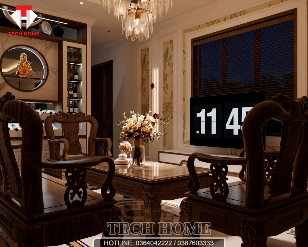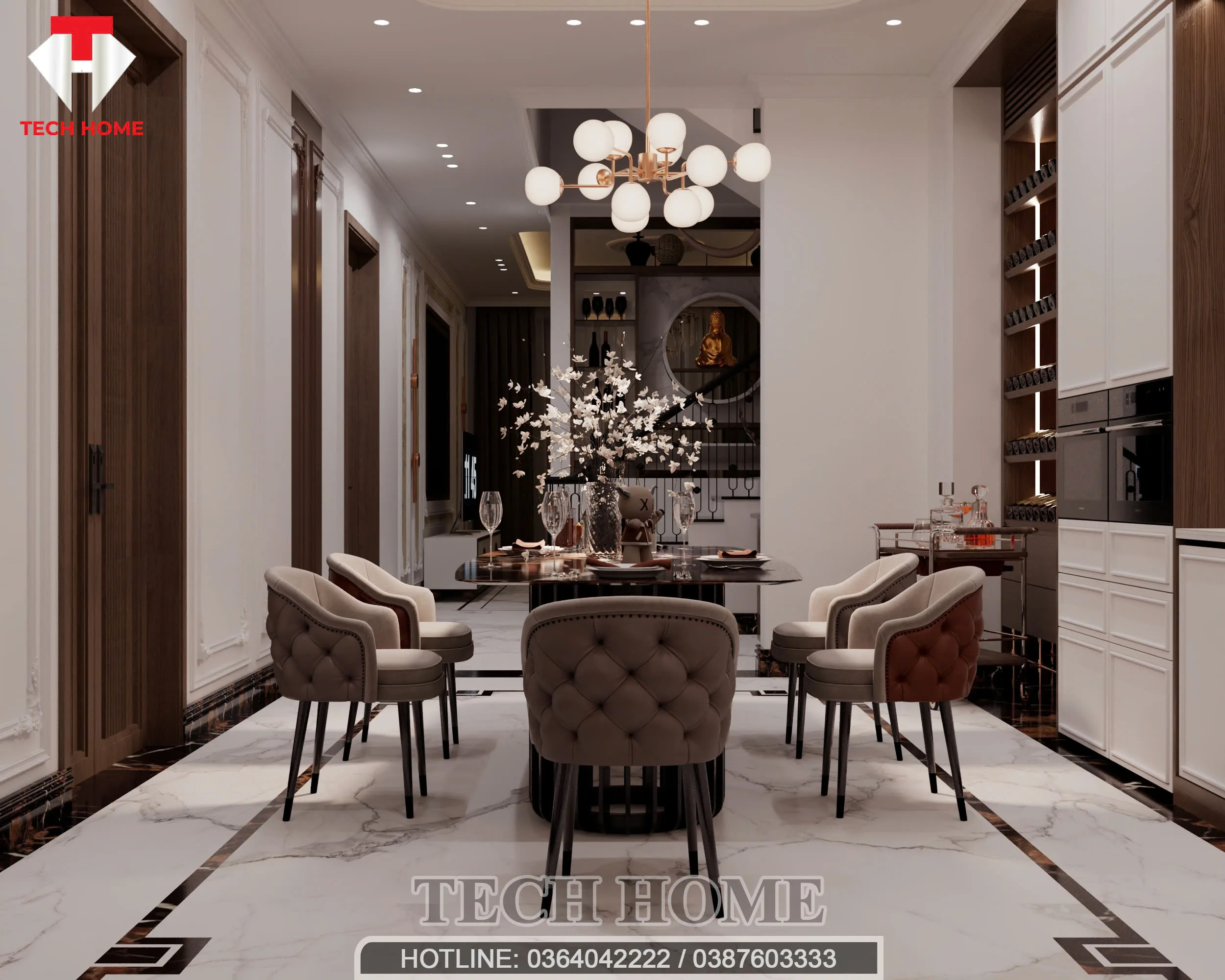 Với các hình ảnh phối cảnh nội thất , Techhome đã khéo léo sử dụng các vật liệu và chi tiết trang trí đặc trưng: Phào chỉ tường và trần thạch cao được tạo hình nghệ thuật, màu sắc trung tính (trắng kem, be, nâu trầm) làm chủ đạo, và các điểm nhấn vàng đồng/vàng kim lấp lánh. Sự xuất hiện của bộ sofa gỗ chạm khắc và tủ rượu đỏ rực càng làm tăng thêm vẻ quyền quý, tạo nên một không gian sống không chỉ đẹp mà còn mang đậm dấu ấn cá nhân và vị thế của gia chủ. Đây là giải pháp hoàn hảo cho những gia đình tìm kiếm sự sang trọng, bền vững và giá trị thẩm mỹ vượt thời gian.