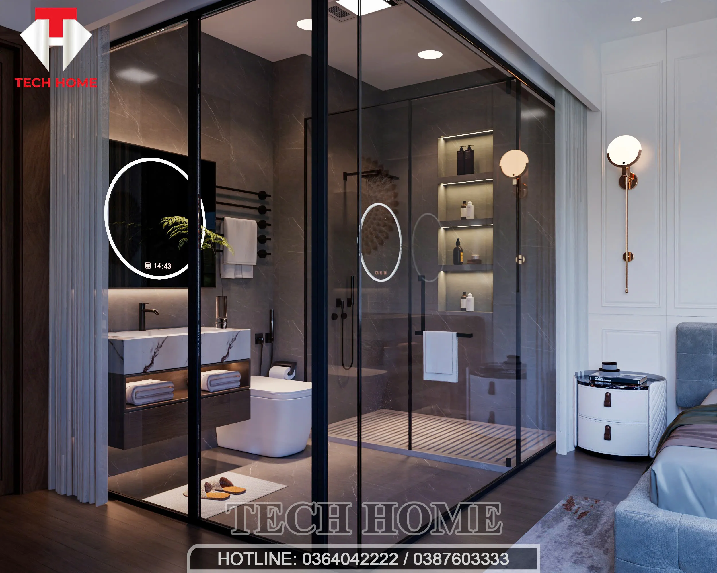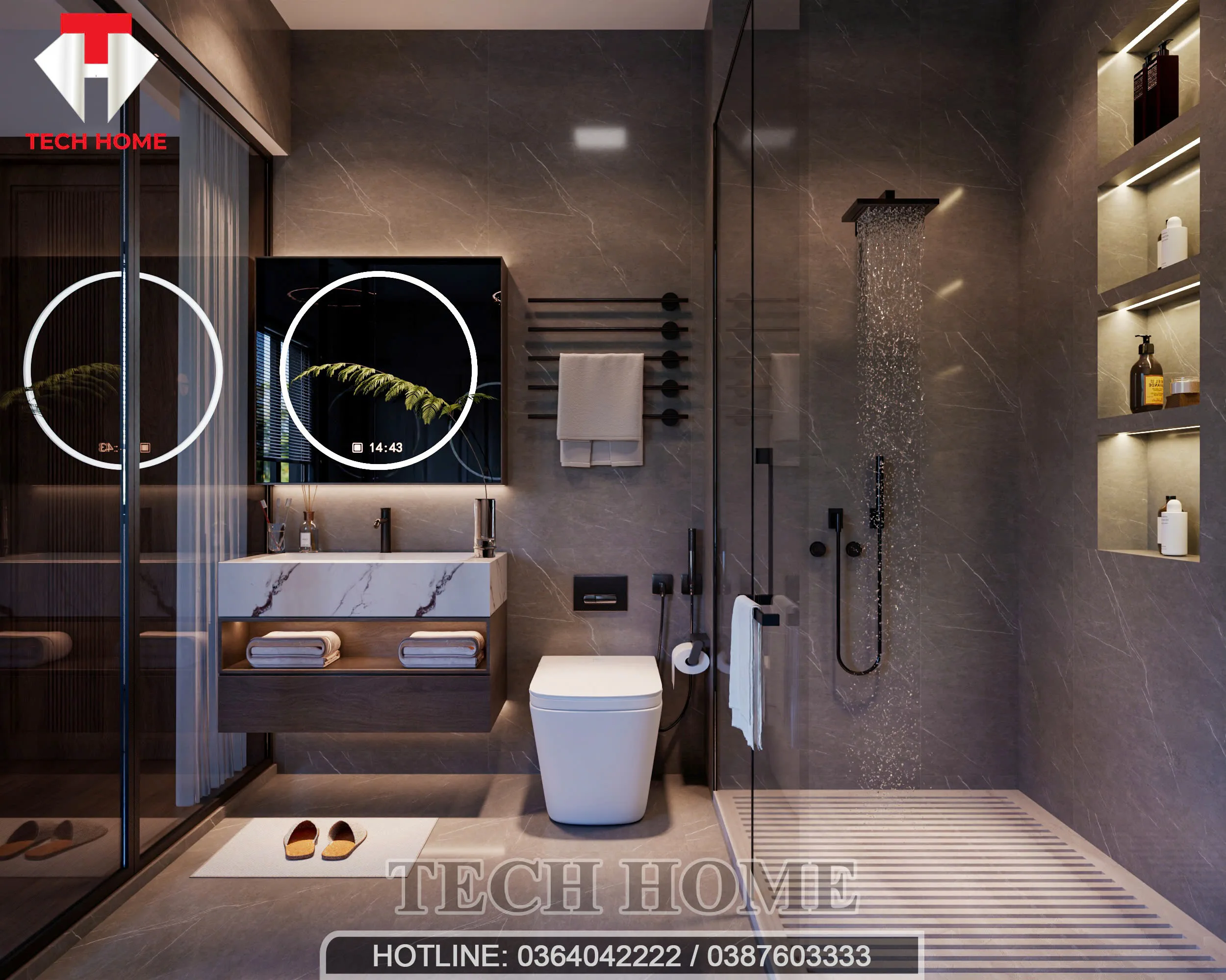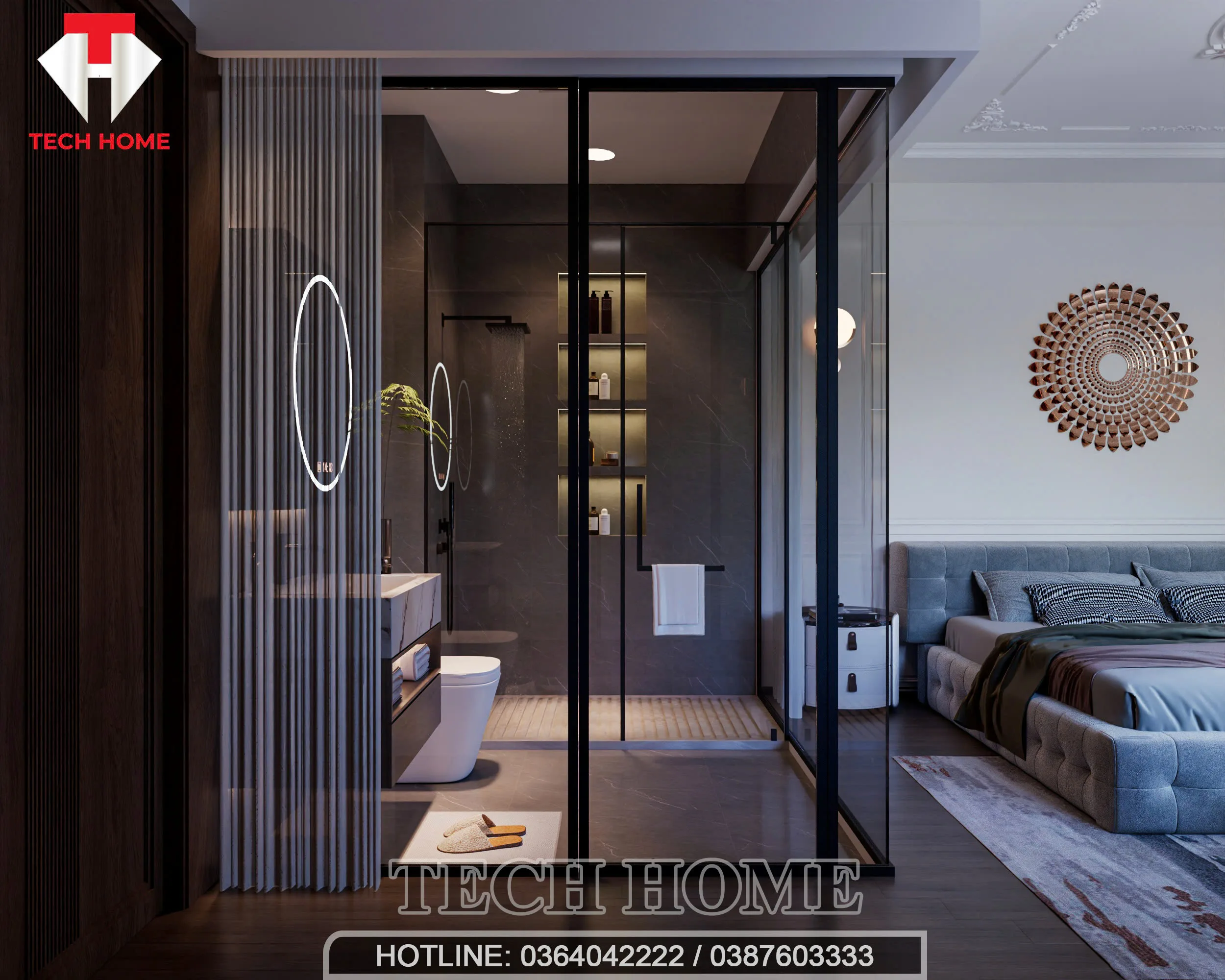 - Thiết Bị Đen Mờ: Các thiết bị vệ sinh, vòi sen, và phụ kiện treo khăn đều chọn tông màu Đen Mờ (Matte Black), tạo nên sự tương phản mạnh mẽ và cá tính với nền đá tối màu, hoàn toàn mang hơi hướng thiết kế Boutique Hotel cao cấp. Sự bố trí này cho thấy Techhome không chỉ giỏi về Nội thất Tân Cổ Điển mà còn cực kỳ tinh tế trong việc tích hợp các yếu tố Hiện Đại Sang Trọng để nâng cao trải nghiệm sống.