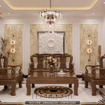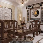 Phòng khách là nơi khẳng định vị thế gia chủ, được thiết kế theo nguyên tắc cân xứng và tỷ lệ vàng của kiến trúc cổ điển. Điểm nhấn trung tâm là bộ sofa – có thể là sofa gỗ tự nhiên chạm khắc hoa văn tinh xảo , hoặc sofa bọc da/nỉ cao cấp với đường nét bo cong mềm mại và kỹ thuật rút múi (tufting) đặc trưng.