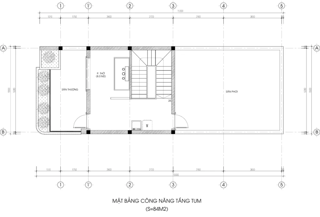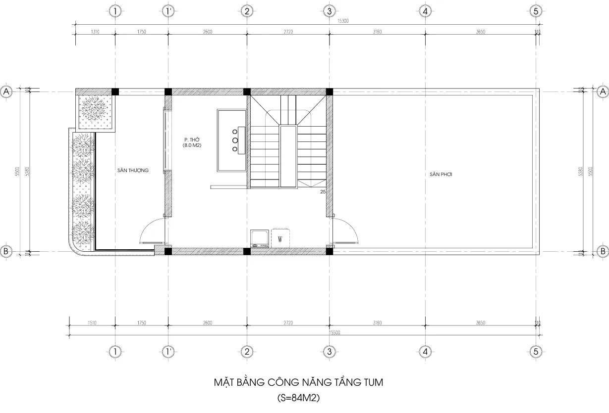 • Diện tích xây dựng: ~84m2/sàn (Kích thước đất 5.5m x 14.1m)