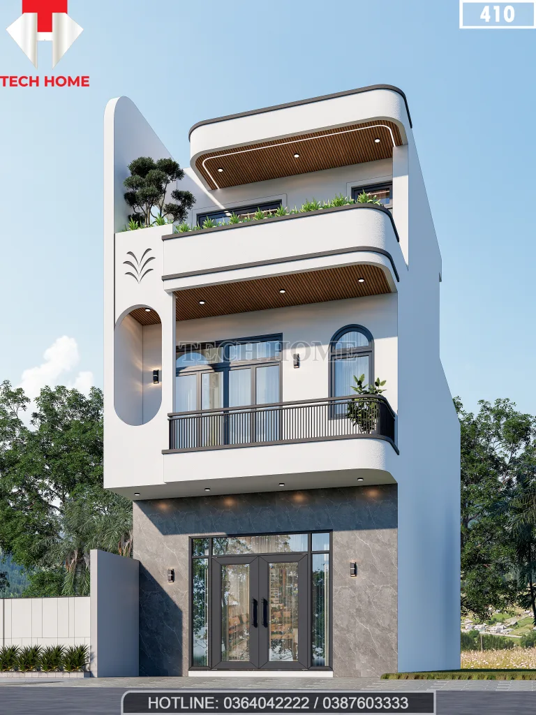 Sự kết hợp màu sắc cũng là một điểm cộng lớn. Trên nền sơn trắng chủ đạo (màu sứ), các kiến trúc sư TechHome đã khéo léo phối thêm màu ghi xám của đá ốp tầng 1 và màu nâu gỗ của trần ban công (sử dụng vật liệu nhựa giả gỗ chịu nước). Chính sự tương phản nhẹ nhàng này đã làm cho mẫu nhà 2 tầng 1 tum đẹp và sang trọng hơn rất nhiều so với việc chỉ dùng sơn nước đơn thuần.