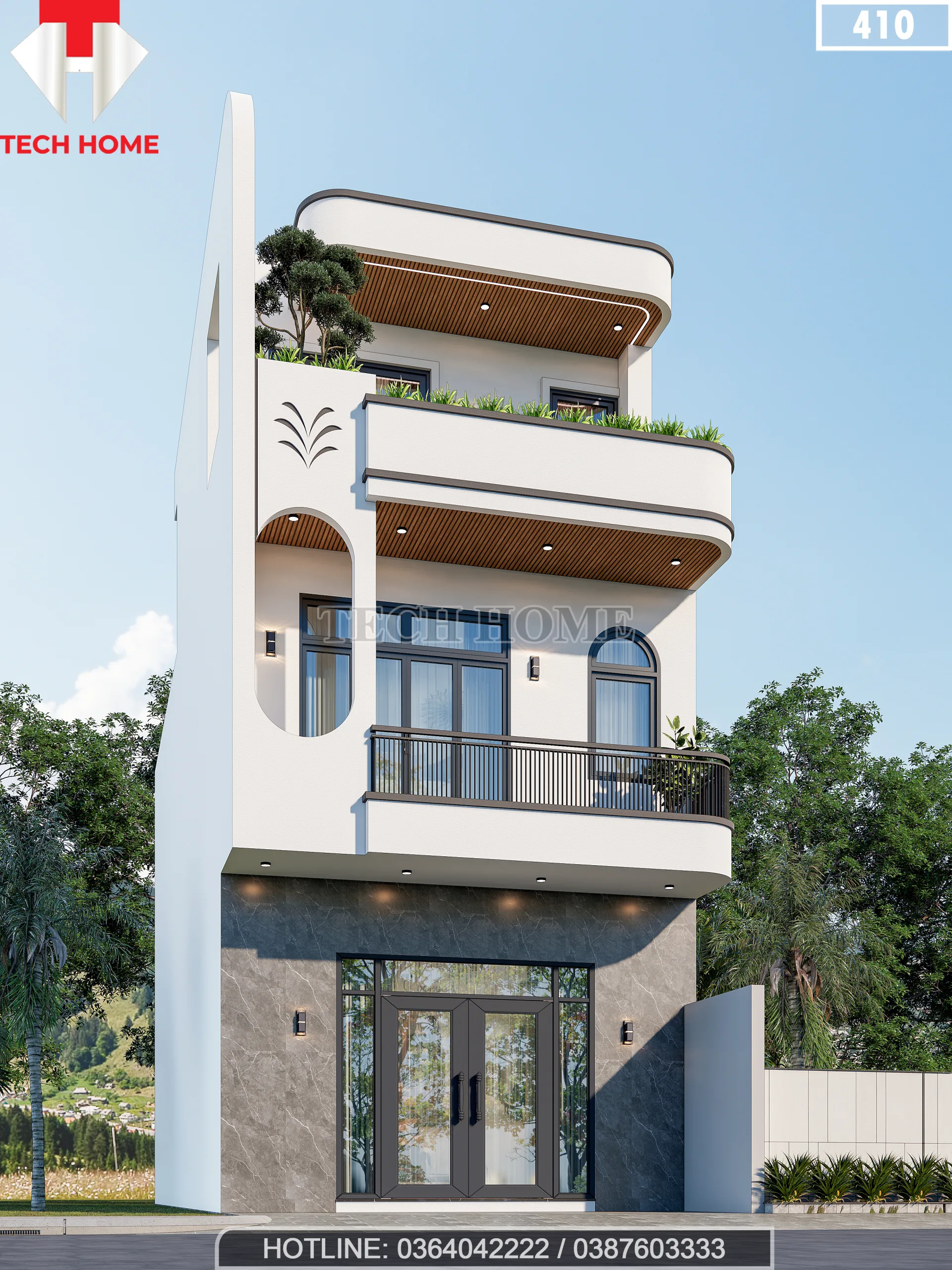 Điểm nhấn đắt giá nhất của mặt tiền chính là mảng tường bên trái được khoét vòm cong mềm mại nối liền từ tầng 2 lên tầng tum. Chi tiết này không chỉ tạo hiệu ứng thị giác độc đáo, giúp ngôi nhà trông cao ráo hơn, mà còn đóng vai trò như một “khung tranh” khổng lồ, ôm lấy ban công và những mảng xanh thiên nhiên.