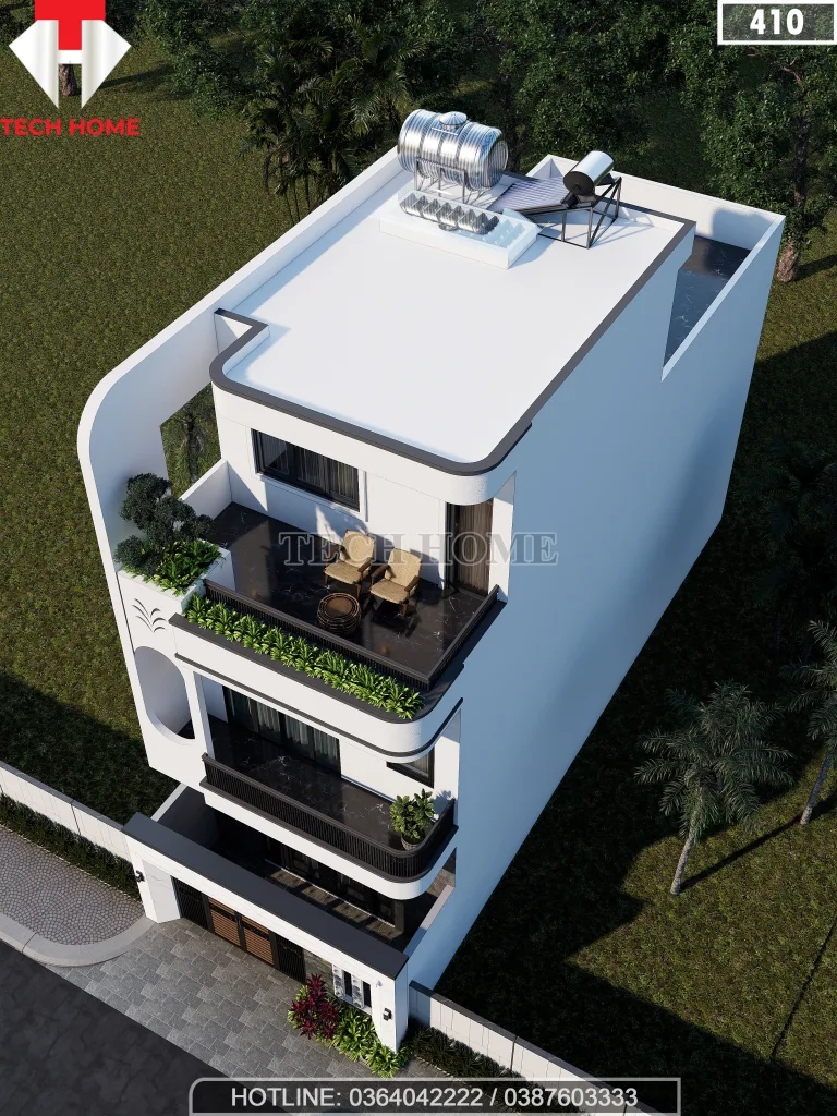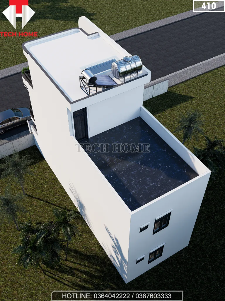 • Sân chơi và Sân phơi: Sân thượng phía trước được thiết kế giàn hoa bê tông (pergola) để gia chủ có thể trồng lan, cây cảnh hoặc đặt một bàn trà nhỏ. Phía sau là sân phơi kín đáo, có vị trí để máy giặt và téc nước.