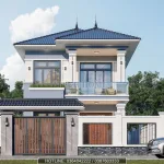Nhìn vào phối cảnh nhà anh Bình, bạn sẽ thấy ngay lý do. Hệ mái Nhật có độ dốc vừa phải, không quá cao vút như mái Thái nhưng đủ để thoát nước mưa cực tốt – điều này cực kỳ quan trọng với khí hậu “sáng nắng chiều mưa” như ở Nghệ An. Hơn nữa, vẻ đẹp của nhà 2 tầng mái Nhật nằm ở sự thanh thoát, nhẹ nhàng nhưng cực kỳ sang trọng. Nó không phô trương, cầu kỳ nhưng nhìn vào là thấy ngay sự bề thế, vững chãi của gia chủ.
