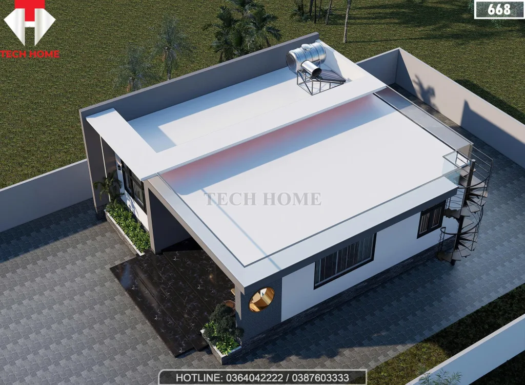 Tổng thể mẫu nhà cấp 4 hiện đại 3 phòng ngủ nhìn từ trên cao với sân thượng và cầu thang xoắn phá cách.