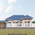 Cái hay của mẫu nhà cấp 4 mái Nhật 4 phòng ngủ chính là hệ mái Nhật màu xanh thẫm cực kỳ sang trọng. Khác với mái Thái có độ dốc lớn, mái Nhật có độ dốc vừa phải, giúp thoát nước tốt nhưng vẫn giữ được nét thanh thoát, nhẹ nhàng.