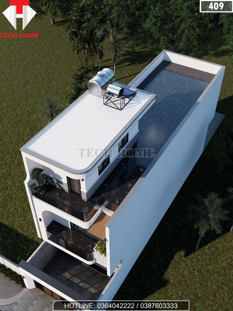 Ấn tượng đầu tiên khi nhìn vào mẫu nhà phố 2 tầng 1 tum này chính là sự trẻ trung và phá cách. Không còn là những khối hộp vuông vức nhàm chán, các KTS Techhome đã khéo léo đưa vào những đường cong “bo góc” cực kỳ mềm mại ở khu vực ban công tầng 2 và mái tầng tum.