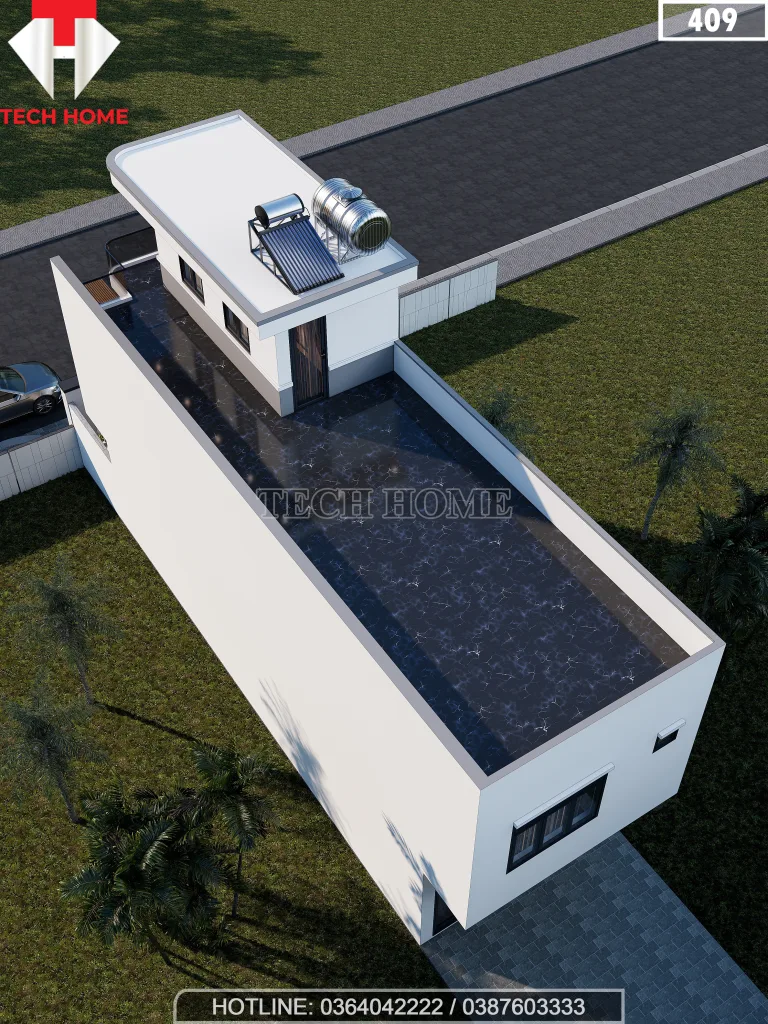 Tầng tum (18m2) không chỉ là nơi che chắn cầu thang mà còn là không gian đa năng. Trong thiết kế mẫu nhà phố 2 tầng 1 tum này, anh Huy có thể sử dụng làm sân phơi hay khu vực kỹ thuật (bồn nước, thái dương năng). Tuy nhiên, với các gia đình khác, đây hoàn toàn có thể biến tấu thành phòng thờ trang nghiêm hoặc một khu vườn trên mái (Roof garden) cực chill.