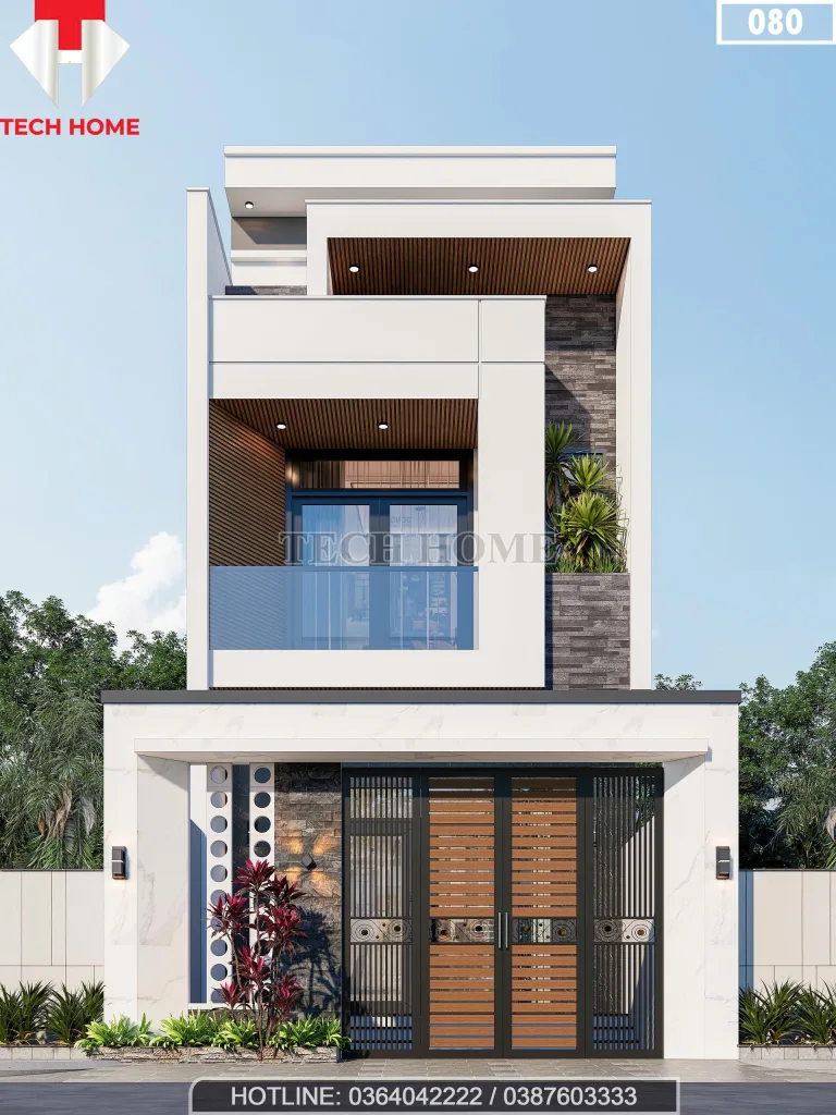 Nhìn vào mặt tiền của ngôi nhà, bạn sẽ thấy ngay sự mạnh mẽ trong hình khối. TechHome sử dụng các mảng miếng vuông vức, giật cấp để tạo chiều sâu, tránh cảm giác đơn điệu của những ngôi nhà ống thông thường. Điểm nhấn đắt giá nhất chính là sự kết hợp vật liệu. Tầng 1 được ốp đá vân mây đen sang trọng, tạo cảm giác vững chãi cho cả công trình. Lên đến tầng 2 và tầng tum, chúng mình sử dụng nhựa giả gỗ ốp trần balcony, kết hợp cùng các mảng tường trắng sứ, tạo nên một bản giao hưởng màu sắc cực kỳ nịnh mắt.