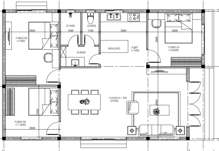 03 phòng ngủ: 1 phòng master + 2 phòng con, đảm bảo sự riêng tư.