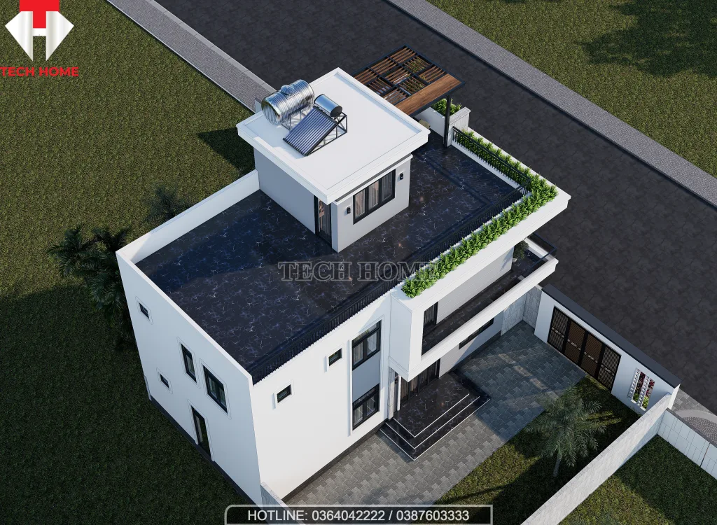 • Sân chơi và sân phơi: Phần lớn diện tích tầng tum được dành cho sân thượng rộng lớn. Tại đây, gia chủ bố trí hệ thống lam che nắng nghệ thuật, có thể đặt bàn trà, trồng cây cảnh, biến nơi đây thành “Sky Bar” tại gia [Hình ảnh phối cảnh].