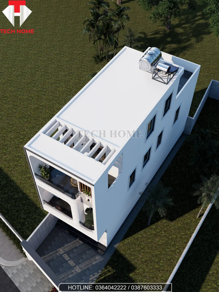 Màu sắc chủ đạo là tông trắng sứ, kết hợp với màu giả gỗ của trần ban công và hệ lam chắn nắng trên tầng tum. Đây là “công thức” kinh điển trong thiết kế nhà ống 3 tầng hiện đại: Trắng để tạo cảm giác rộng rãi, Gỗ để tạo sự ấm cúng và sang trọng. Hệ cửa nhôm kính Xingfa màu xám đen là điểm nhấn khỏe khoắn, cân bằng lại sự mềm mại của kiến trúc.