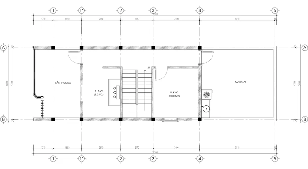 Tầng cao nhất của mẫu thiết kế nhà ống 3 tầng hiện đại này dành cho không gian tĩnh tại. Phòng thờ rộng 8.0m2 được đặt trang trọng phía trước, hướng ra sân thượng (sân thông). Phía sau là một phòng kho 10.0m2 và khu vực sân phơi.