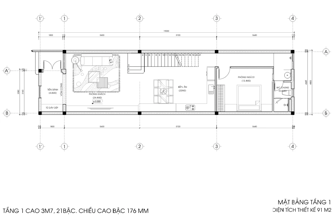 | Tầng 1 | 91m2 | 3m7 | Tiền sảnh (4,6m2), Phòng Khách (24,4m2), Bếp + Ăn (22m2), 1 Phòng Ngủ (13,4m2), WC chung |