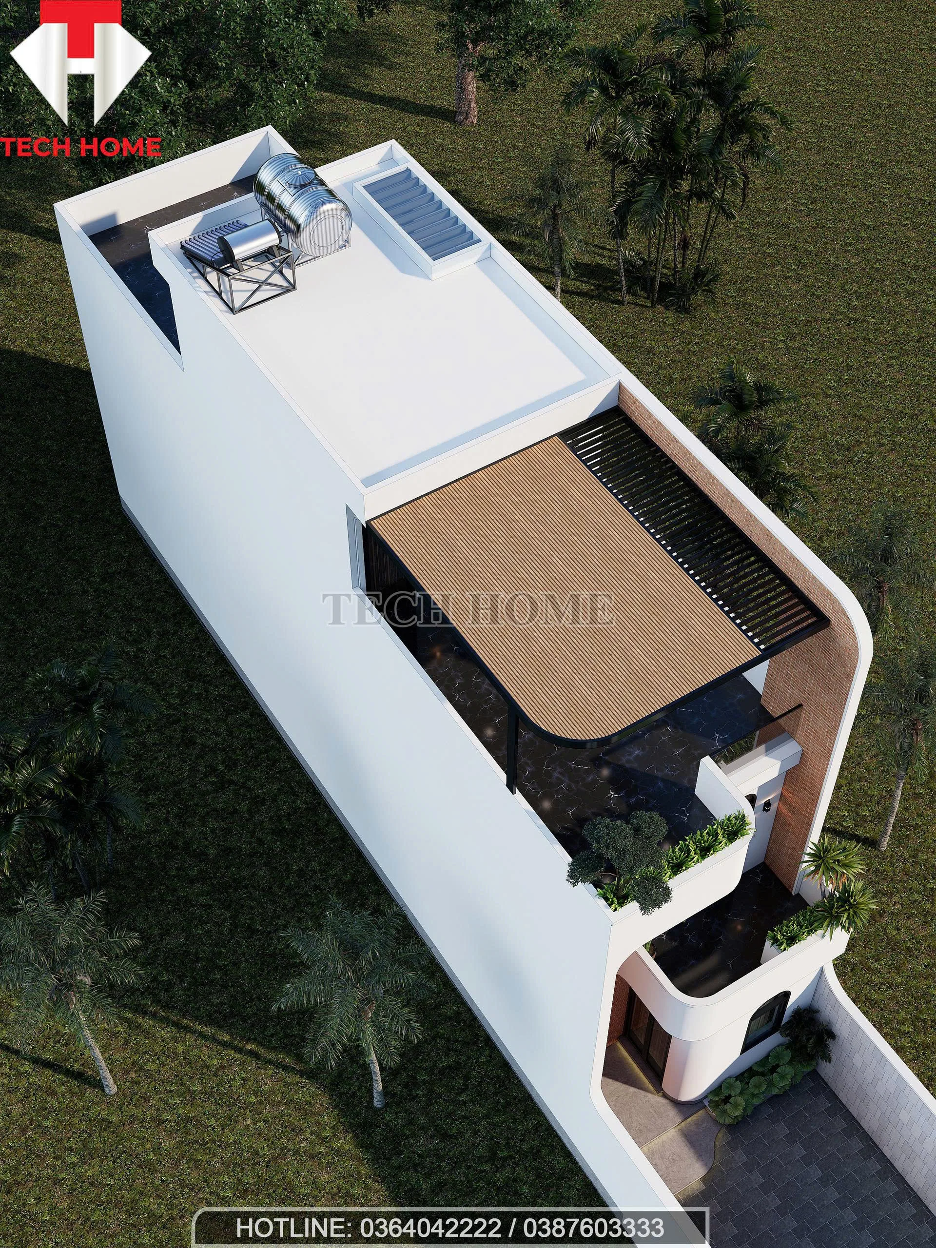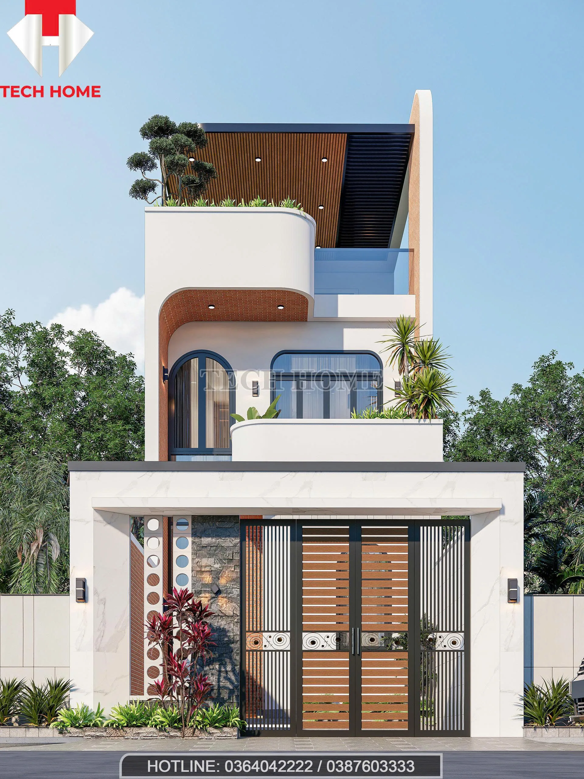 Phong cách thiết kế nhà phố hiện đại 2 tầng 1 tum được lựa chọn, nhấn mạnh vào hình khối đơn giản, các mảng đặc rỗng đối xứng và đặc biệt là việc sử dụng các đường cong mềm mại ở ban công, cửa sổ để phá vỡ sự khô cứng, tạo nên một vẻ đẹp tinh tế và khác biệt. Đây là một giải pháp kiến trúc lý tưởng cho những gia đình mong muốn một không gian sống sang trọng, bền vững và hợp xu hướng.