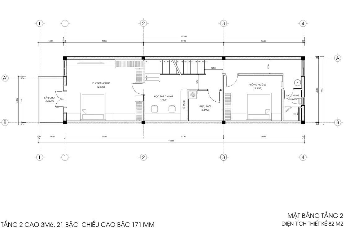 | Tầng 2 | 82m2 | 3m6 | 2 Phòng Ngủ (24m2 và 13,4m2), Phòng Học Tập Chung (10m2), Sân Chơi (5,3m2), Giặt Phơi (5,3m2), WC Chung. |