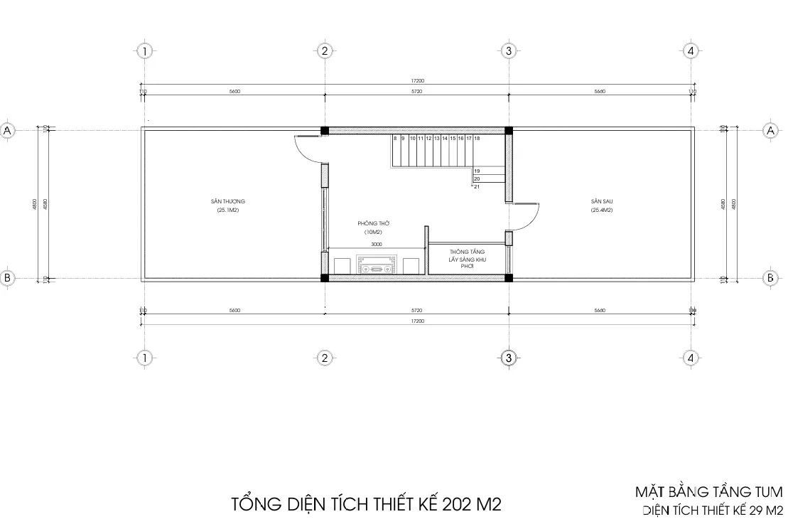 | Tầng Tum | 29m2 | Phòng Thờ (10m2), Sân Thượng và sân sau thông thoáng , khu vực thông tầng lấy sáng. |
