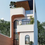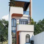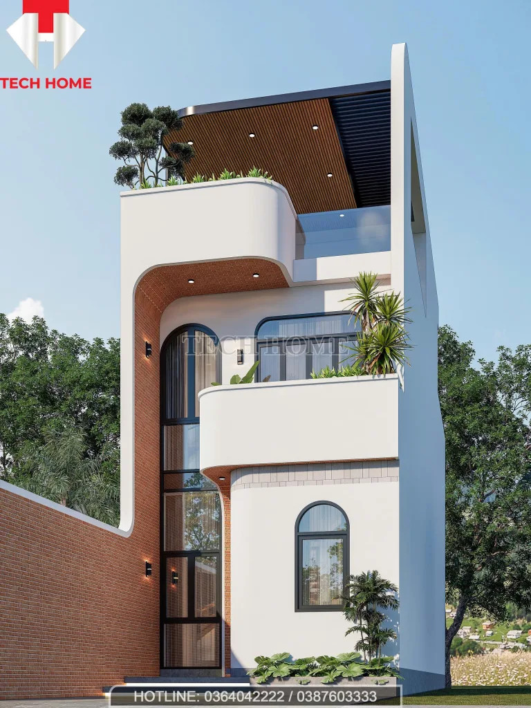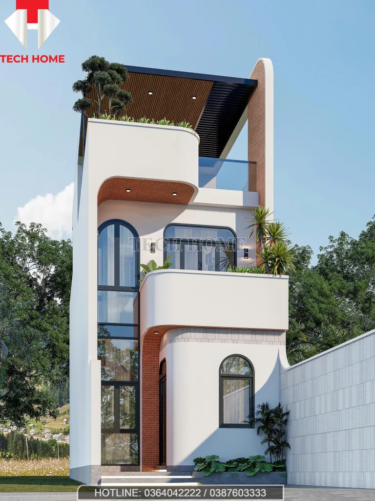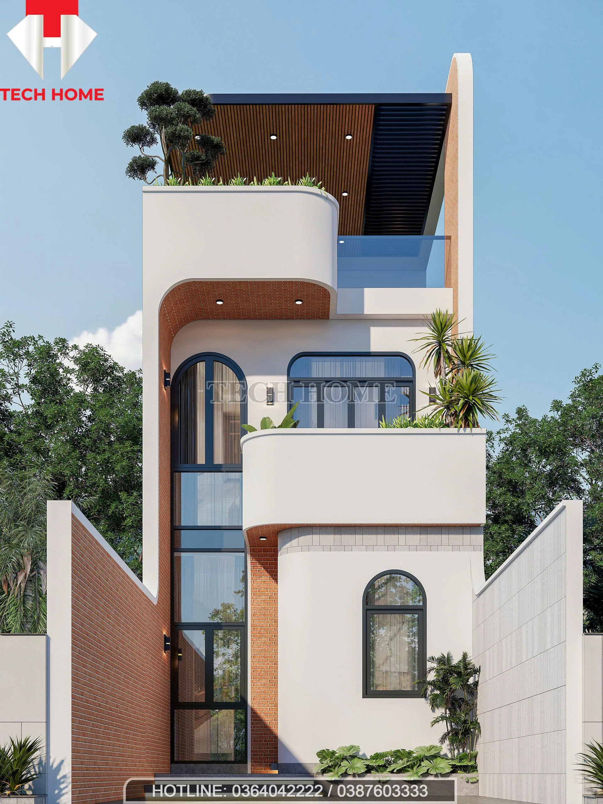 - Hình khối và Màu sắc: Kiến trúc sử dụng khối hộp chữ nhật đặc trưng của nhà phố, nhưng được điểm xuyết bởi các đường cong bo tròn tinh tế ở ban công và khu vực sảnh tầng 1. Màu sắc chủ đạo là tone trắng sứ, kết hợp với màu gạch đỏ trần thạch cao/ốp tường tạo nên sự tương phản sang trọng, hiện đại .