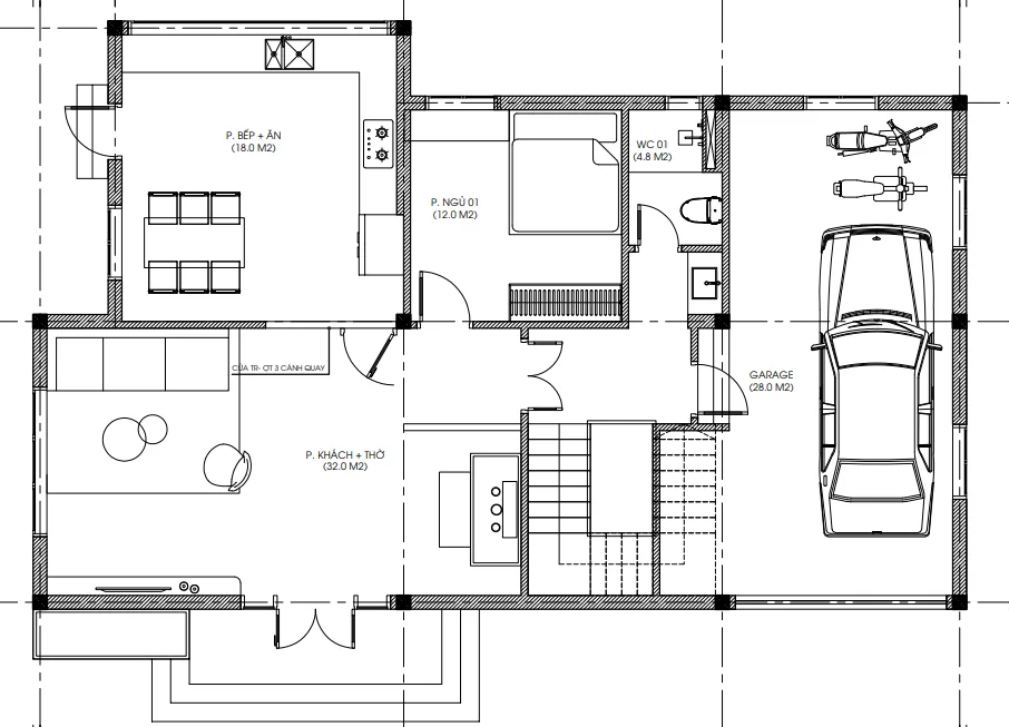 Garage (28m²): Sức chứa 1 ô tô + 2 xe máy, cửa cuốn tự động hiện đại.