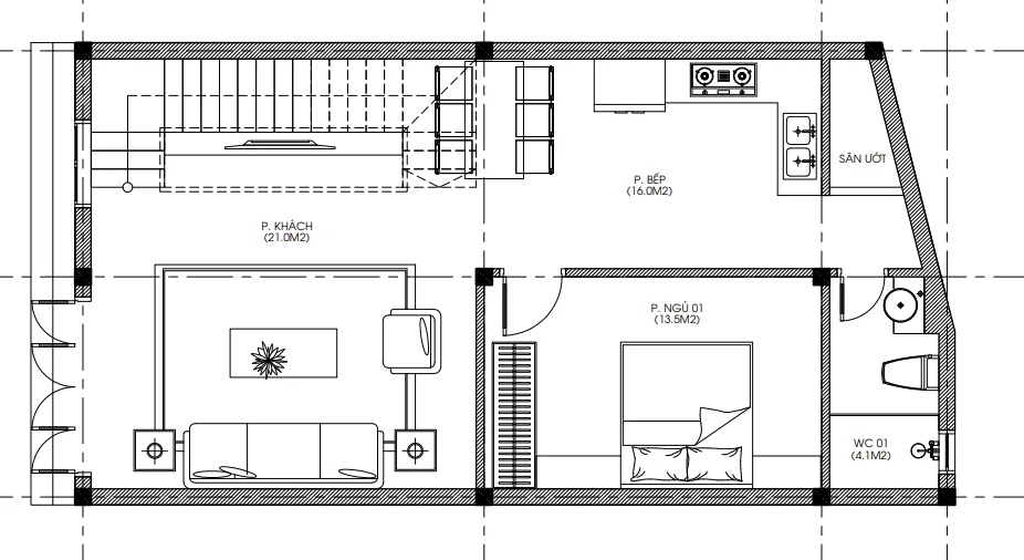 • Tầng 1: Phòng khách rộng rãi, bếp – ăn liên thông, 1 phòng ngủ và khu vệ sinh.