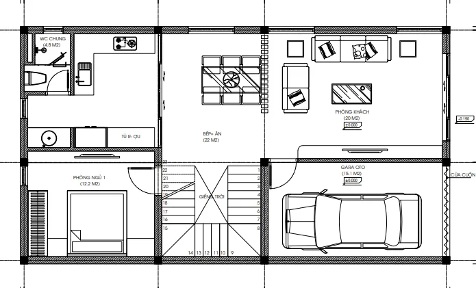 Garage ô tô (15m²) đáp ứng nhu cầu để xe ngay trong nhà – một yếu tố quan trọng với gia đình ở phố.