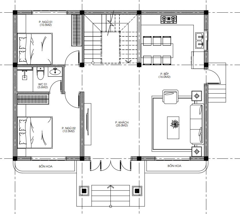 Đáp ứng công năng: Với 2 tầng, gia chủ có thể bố trí 3 – 5 phòng ngủ, phòng khách, bếp, thờ và khu sinh hoạt tiện nghi.