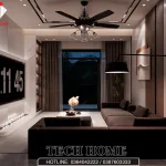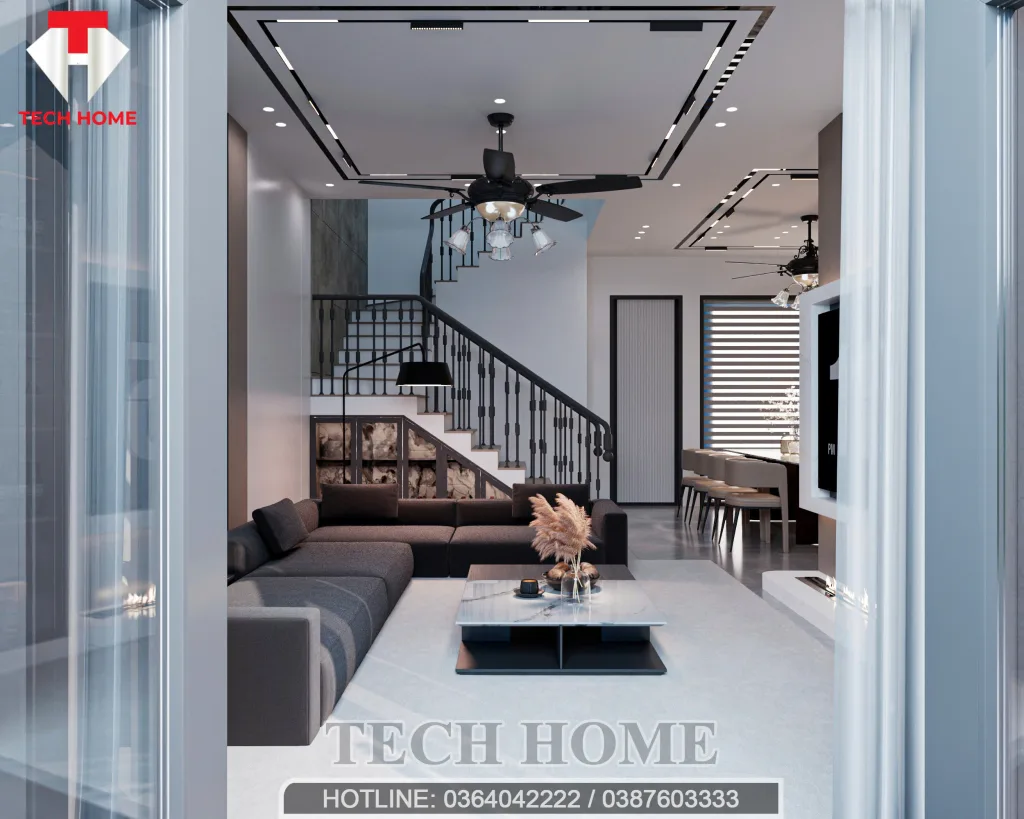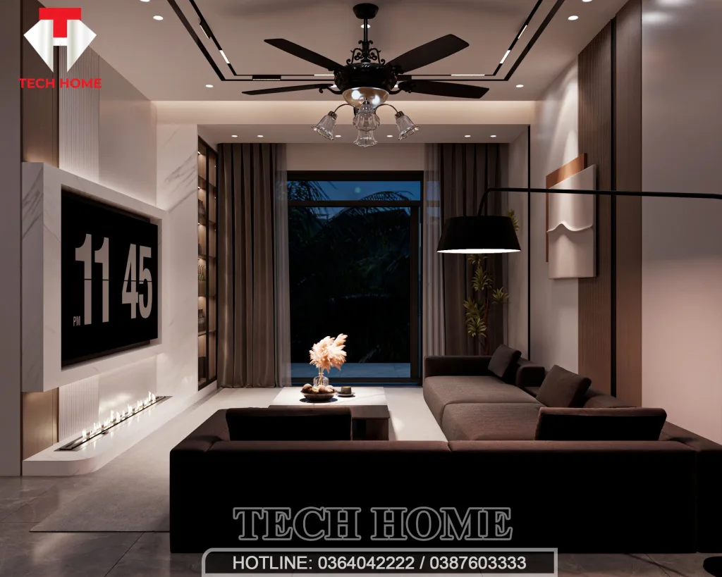 Điểm mà đội ngũ kiến trúc sư Techhome tâm đắc nhất chính là hệ thống ánh sáng. Chúng mình không dùng những bộ đèn chùm rườm rà. Thay vào đó là sự kết hợp giữa đèn LED âm trần dọc theo các khe hắt sáng trên trần thạch cao và một chiếc quạt trần tích hợp đèn phong cách tân cổ điển nhẹ nhàng. Cách bố trí này giúp ánh sáng lan tỏa đều, tạo nên một không gian nội thất hiện đại sang trọng nhưng vẫn rất ấm cúng.
