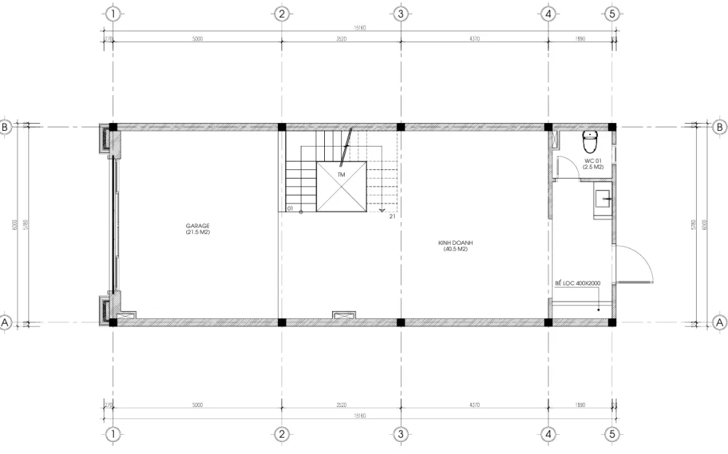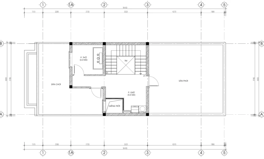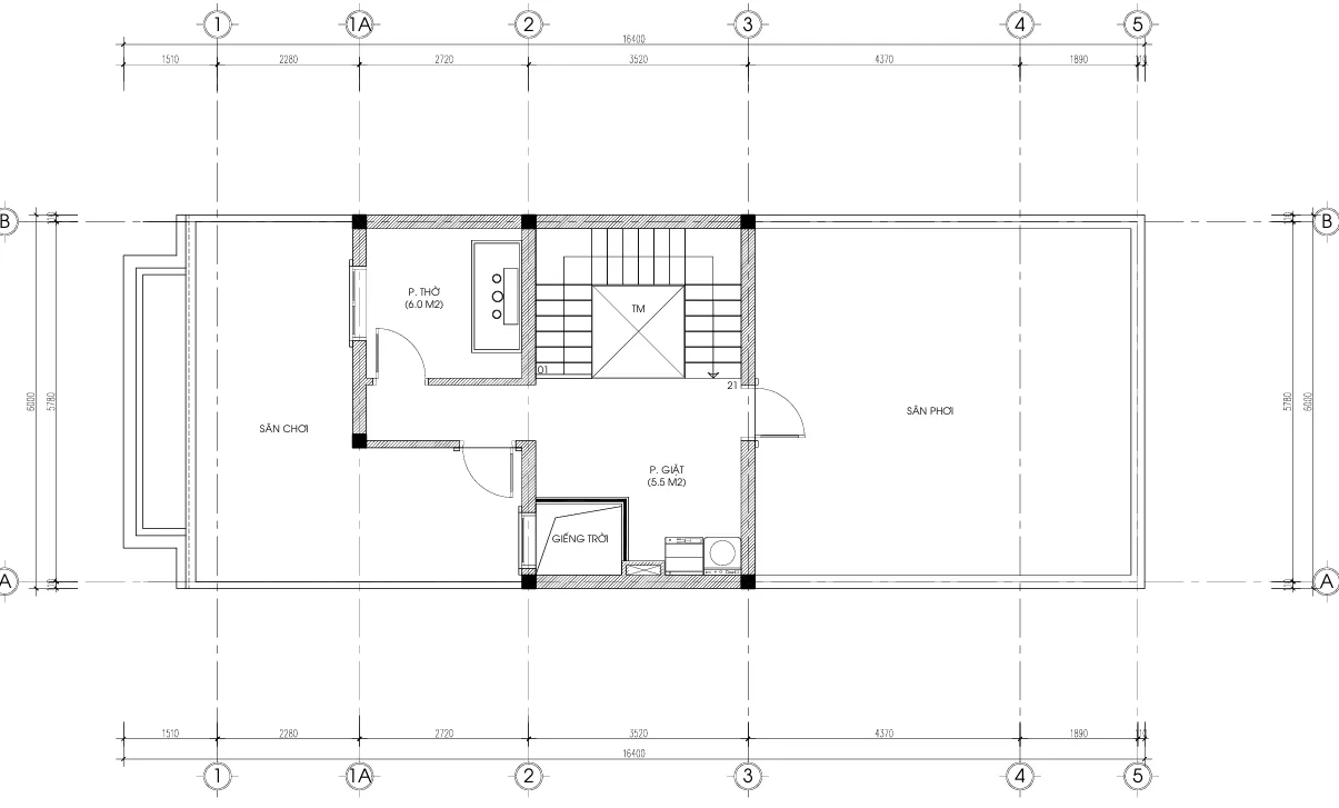 • Khu vực giữa là Cầu thang bộ ôm lấy Thang máy (TM) – một trang bị không thể thiếu trong các ngôi nhà phố cao tầng hiện đại.