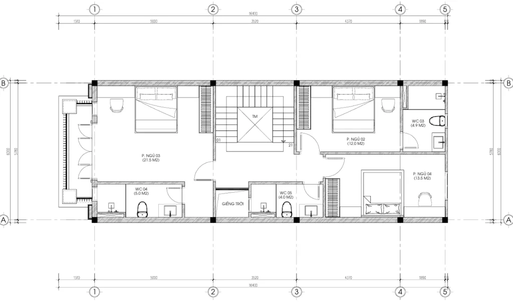 • Phía sau là phòng ngủ 02 (12m2), có WC khép kín 4,9m2. Và phòng ngủ 04 (13.5m2) và 1 vệ sinh chung 4m2, đảm bảo sự tiện dụng cho các thành viên trong gia đình.
