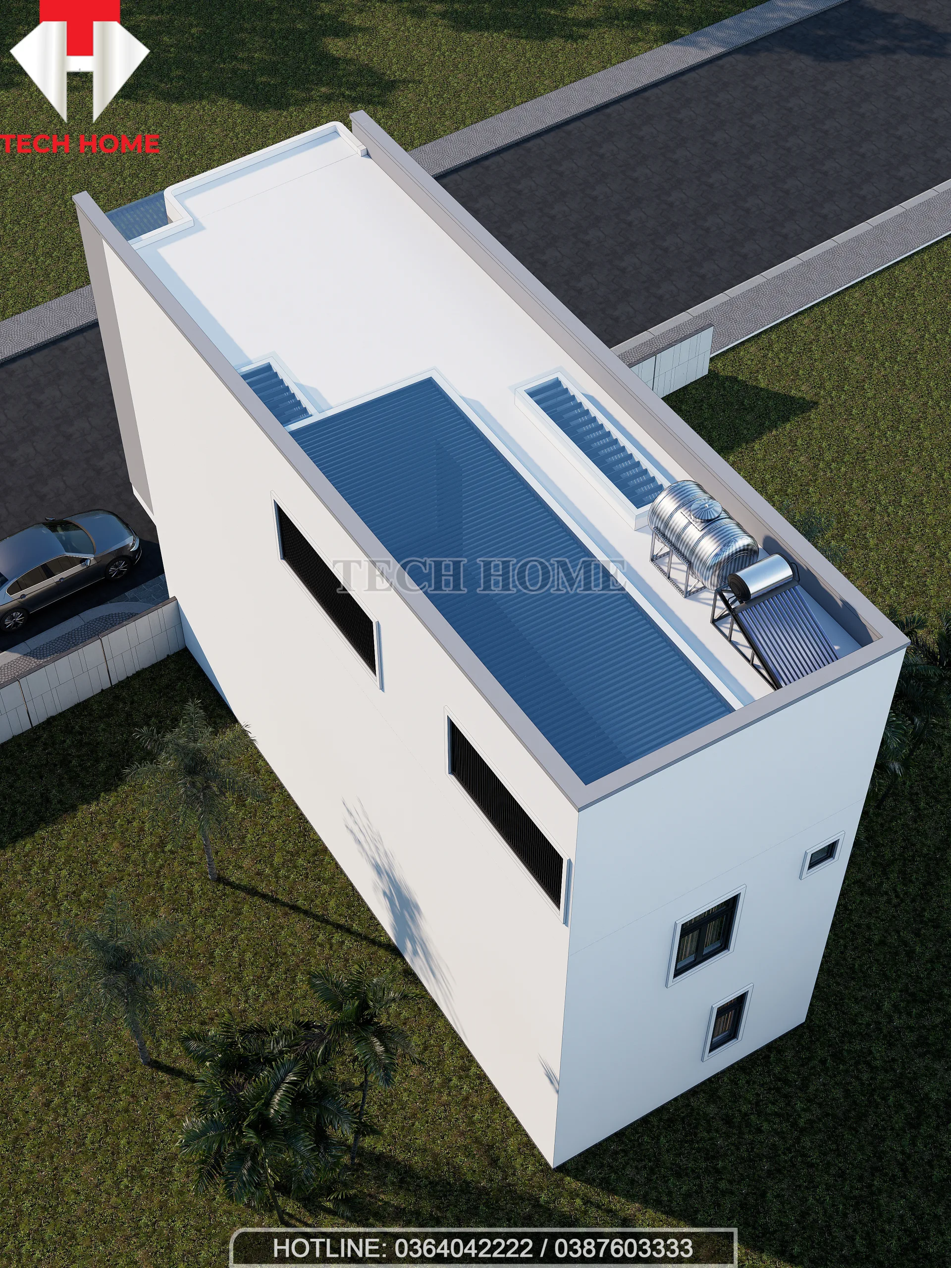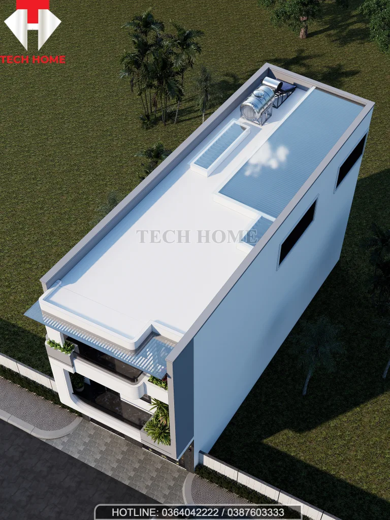 Mái bằng tiện dụng: Tầng mái được thiết kế phẳng, bố trí khu vực kỹ thuật để bồn nước và thái dương năng gọn gàng, đảm bảo thẩm mỹ tổng thể cho ngôi nhà nhìn từ trên cao.