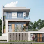 Khi nhìn vào bản phối cảnh 3D mặt tiền, điều đầu tiên đập vào mắt chúng ta chính là sự khỏe khoắn. Thiết kế nhà phố 3 tầng hiện đại của anh An không rườm rà hoa văn, phào chỉ như kiến trúc tân cổ điển. Thay vào đó, nó sử dụng các khối hình học vuông vức, đua ra thụt vào đầy chủ ý để tạo chiều sâu cho công trình.