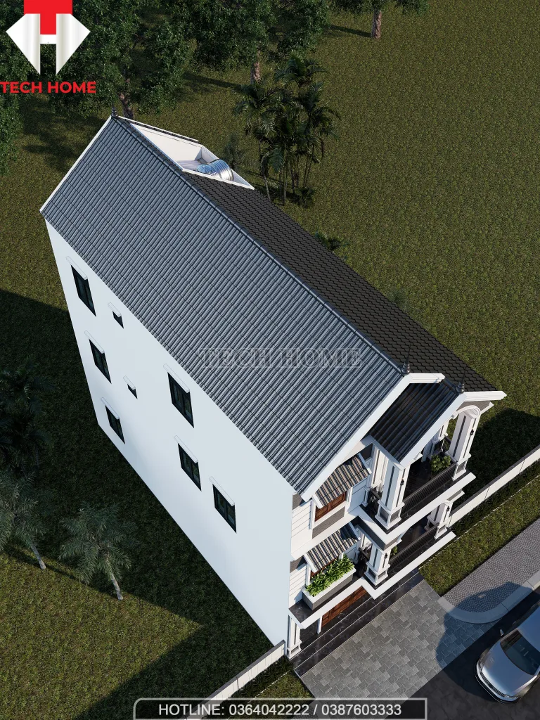 • Tăng chiều cao thẩm mỹ: Hệ mái chóp nhọn giúp mẫu thiết kế nhà phố 3 tầng mái thái trông cao hơn, bề thế hơn rất nhiều so với mái bằng, xóa tan cảm giác “nhà ống” chật hẹp.