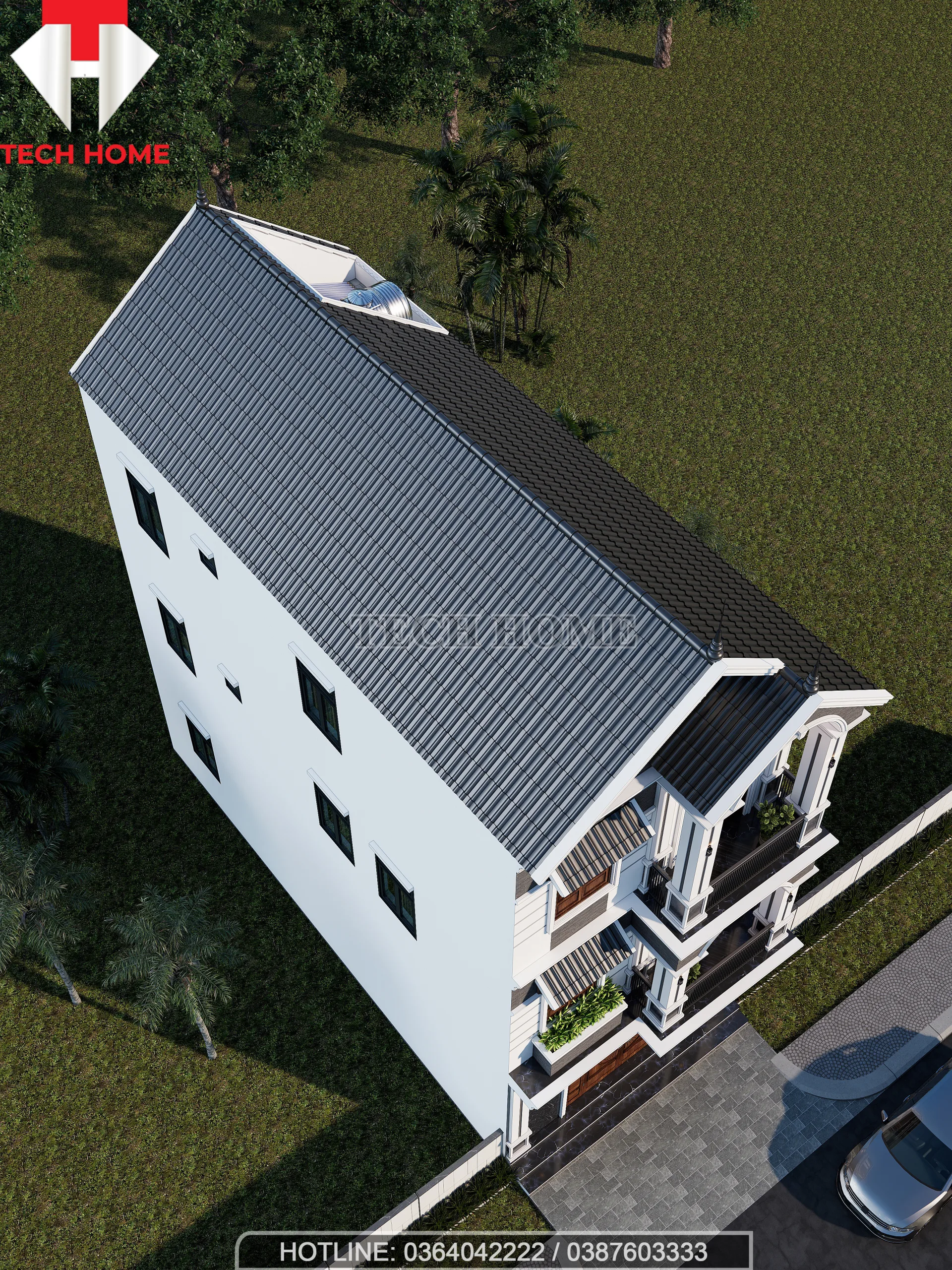 Công trình được thực hiện bởi Công ty Cổ phần Kiến trúc và Xây dựng Techhome, không chỉ giải quyết bài toán về diện tích đất đặc trưng của nhà phố (mặt tiền hẹp, chiều sâu dài) mà còn kiến tạo nên một diện mạo bề thế, sang trọng nhờ hệ mái Thái cao ráo kết hợp cùng ngôn ngữ kiến trúc Tân cổ điển .