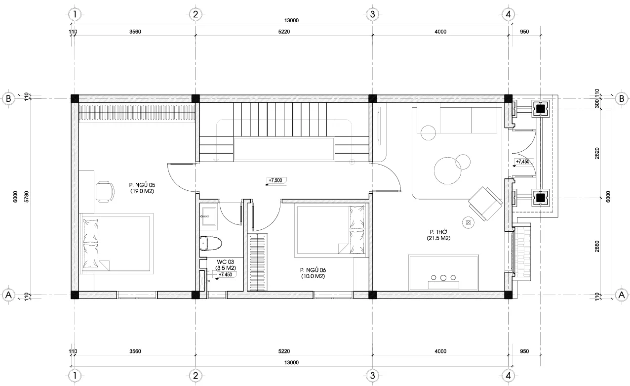 • Phòng thờ (21.5m2): Hướng ra mặt tiền, đón vượng khí. Ban công phía trước giúp không gian thờ cúng luôn thoáng đãng, không bị ám khói hương.