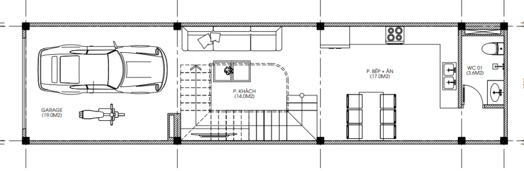 Tầng 1: thường thiết kế làm gara, cửa hàng, showroom hoặc văn phòng nhỏ, giúp gia chủ dễ dàng vừa ở vừa kinh doanh.