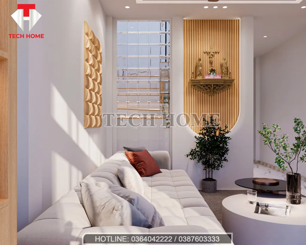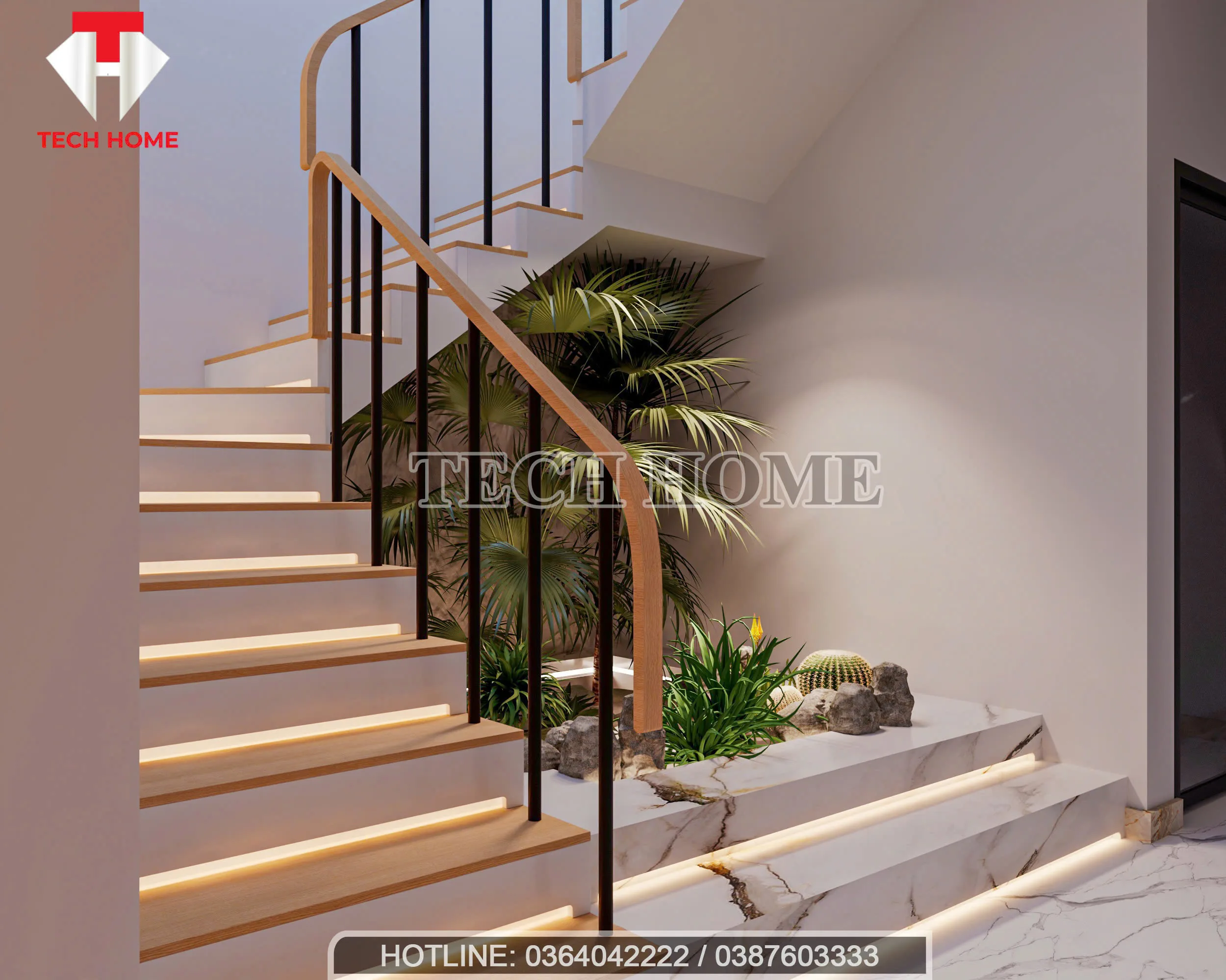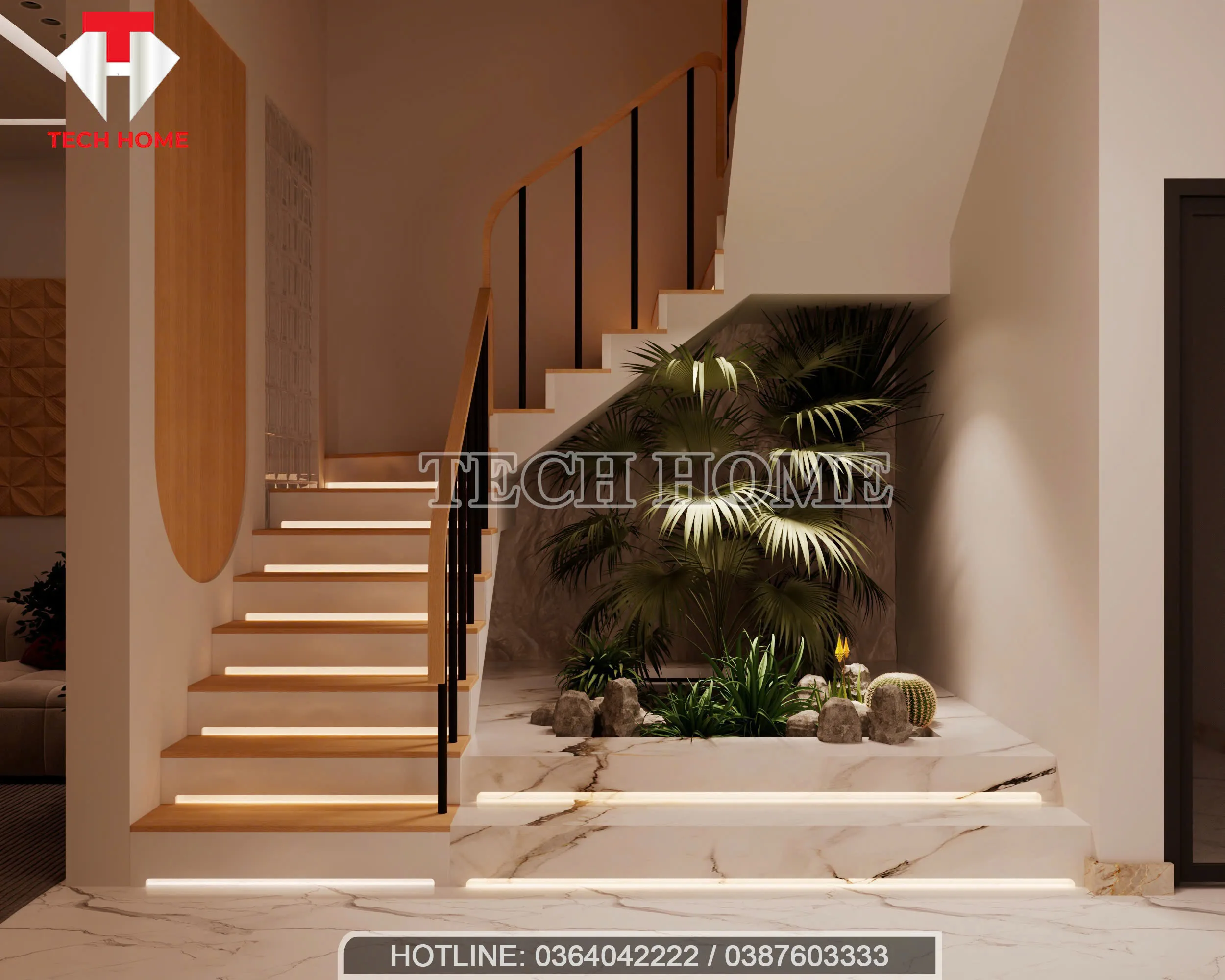 Thay vì để gầm cầu thang là “góc chết”, Techhome đã biến nó thành một tiểu cảnh xanh mát. Việc đưa cây xanh vào trong thiết kế nội thất hiện đại không chỉ giúp lọc không khí mà còn làm dịu đi sự cứng nhắc của các khối bê tông. Những bậc thang ốp gỗ sáng màu, tích hợp đèn LED âm bản không chỉ đảm bảo an toàn khi di chuyển ban đêm mà còn tạo hiệu ứng thẩm mỹ cực kỳ bắt mắt.