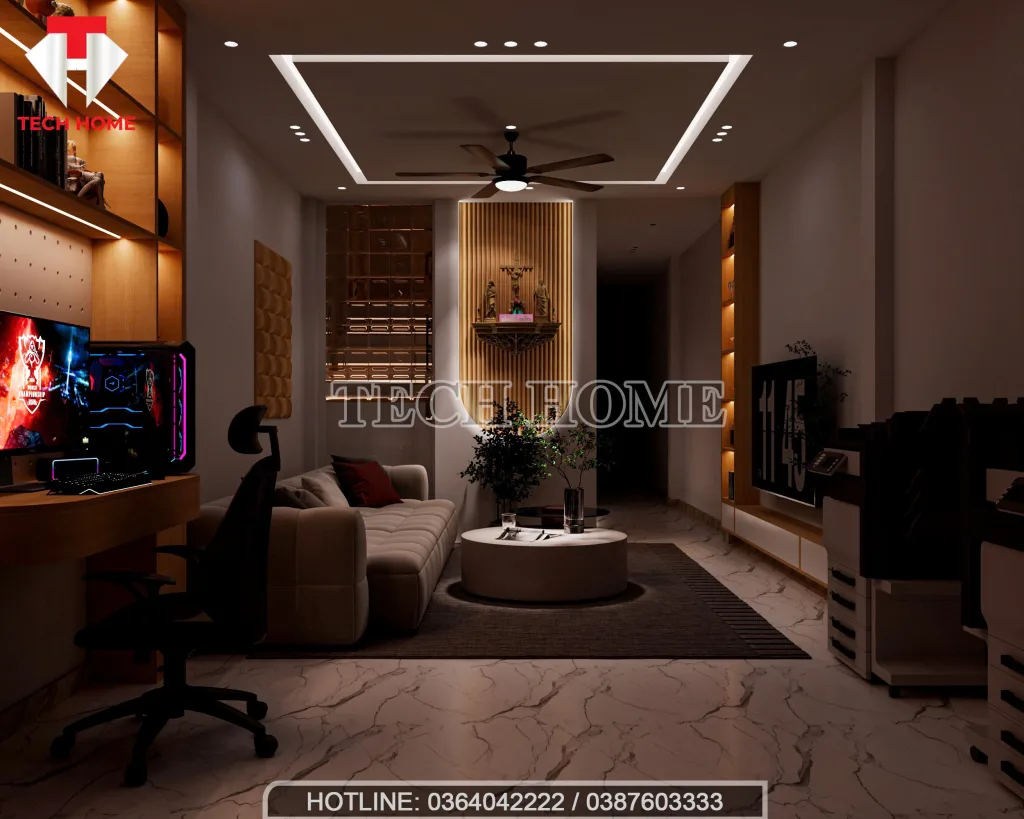 Bước vào từ cửa chính, không gian đầu tiên là khu vực phòng khách kết hợp kinh doanh. Đây là bộ mặt của ngôi nhà, nơi thể hiện rõ nét nhất tư duy thiết kế nội thất hiện đại mà Techhome theo đuổi.