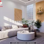 Điểm nhấn đầu tiên chính là bộ sofa màu be nhẹ nhàng, kết hợp cùng bàn trà tròn tối giản. Để không gian không bị đơn điệu, chúng tôi sử dụng vách ốp gỗ trang trí với các họa tiết 3D nổi khối. Ánh sáng tự nhiên từ cửa chính tràn vào, làm nổi bật nền gạch giả đá vân mây trắng muốt, tạo cảm giác sạch sẽ và thoáng đãng.