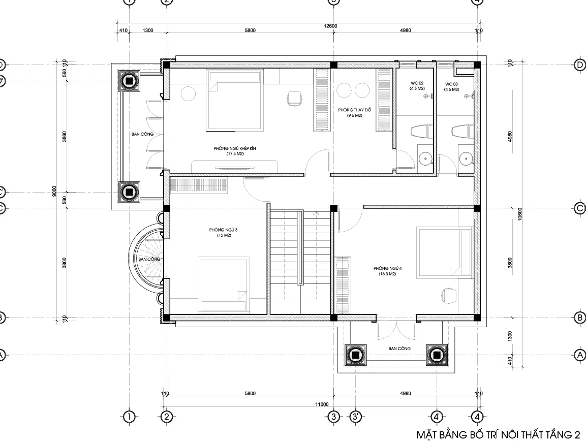 Không gian tầng 2 được dành trọn vẹn cho sự nghỉ ngơi với 03 phòng ngủ. Trong đó, Phòng ngủ Master (17.3m2) dành cho vợ chồng anh Đô được thiết kế như một căn hộ cao cấp với phòng thay đồ riêng (9.6m2), vệ sinh khép kín và ban công vòm lớn hướng ra mặt tiền – nơi lý tưởng để thưởng trà và ngắm cảnh mỗi sáng. Hai phòng ngủ còn lại dành cho các con đều có diện tích rộng rãi (15m2 – 16.3m2) và cửa sổ lớn đón gió trời .