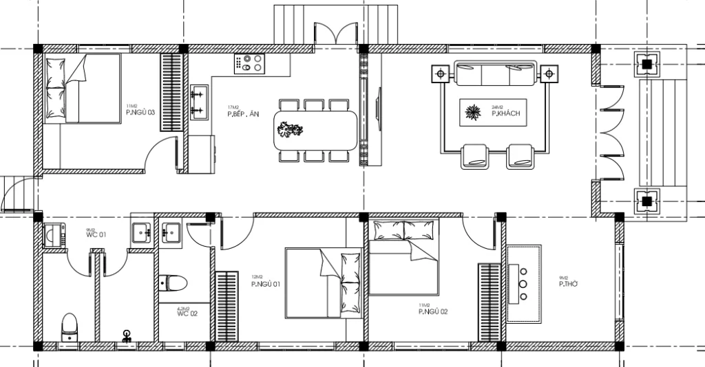 Thường bố trí: tầng 1 phòng khách, bếp – ăn, phòng ngủ; tầng 2 phòng ngủ, phòng thờ, ban công.
